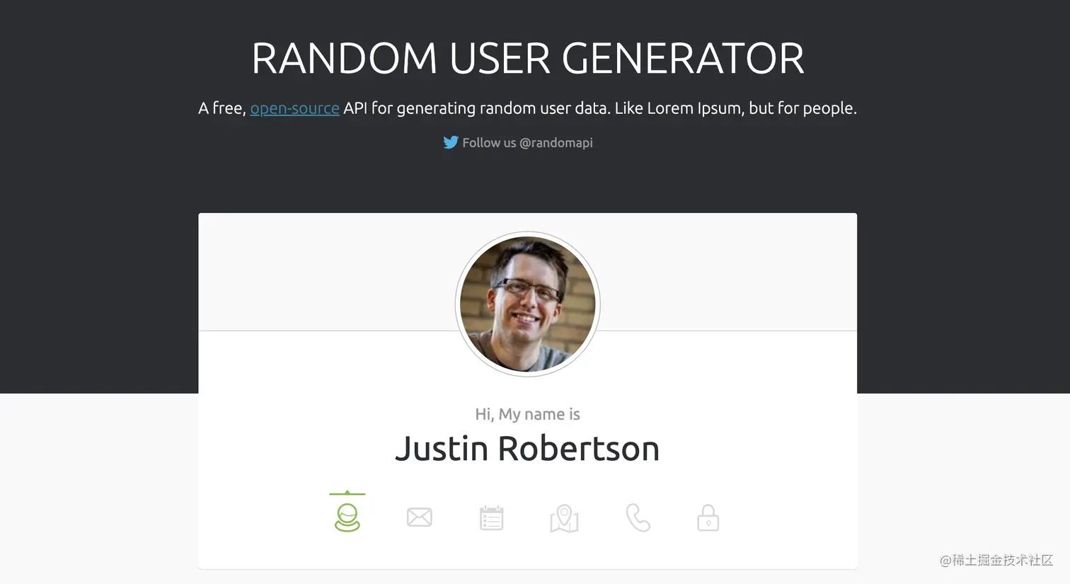 - Randomuser.me-Node - 随机用户信息生成器:用来生成随机用户数据的免费开源 API - 可以返回 JSON、CSV、YAML 或 XML 格式的各种数据,并包含每个“用户”的大量信息,包括个人资料照片等。