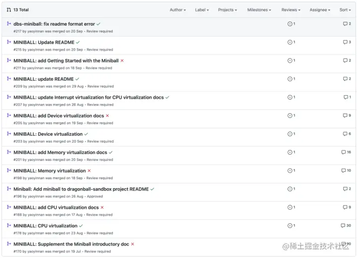 (图/MiniBall 项目完成过程中共提交合并了 13 个 PRs,涵盖 CPU 虚拟化、内存虚拟化、设备虚拟化、架构文档和使用指南等多项内容)