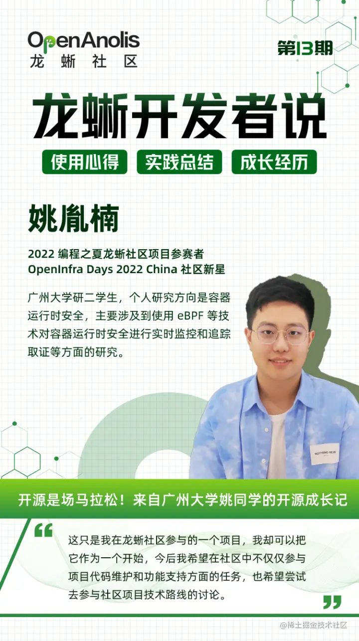 「龙蜥开发者说」第 13 期来了!开发者与开源社区相辅相成,相互成就,这些个人在龙蜥社区的使用心得、实践总结和技术成长经历都是宝贵的,我们希望在这里让更多人看见技术的力量。本期故事,我们邀请了龙蜥社区开发者姚胤楠来分享「开源是场马拉松!来自广州大学姚同学的开源成长记 」。