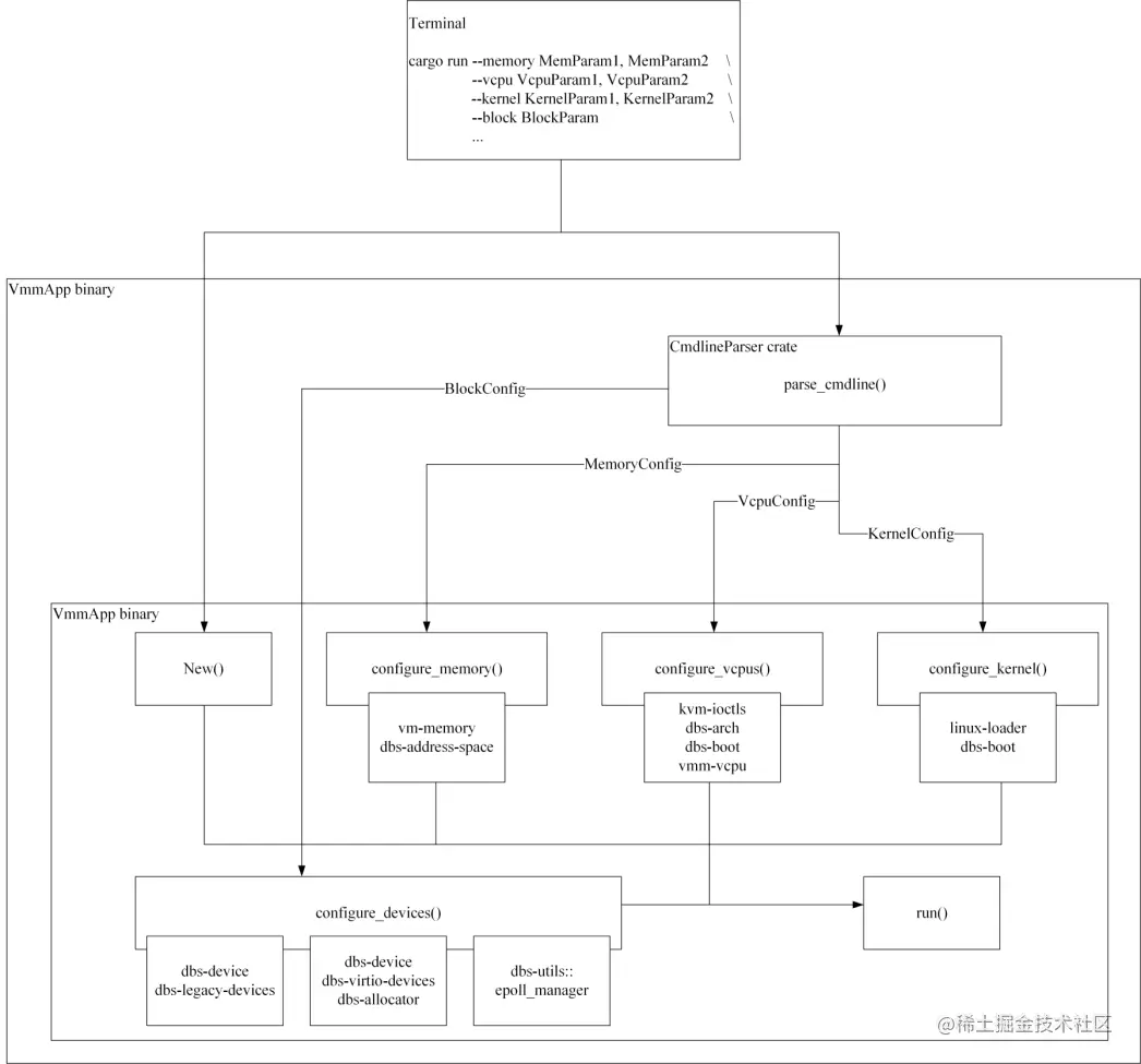 (图 / MiniBall 的架构:展示了 CPU 虚拟化、内存虚拟化、设备虚拟化、加载内核的各个模块及所依赖的 crates)