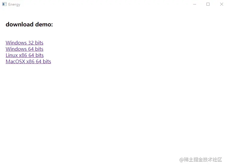 <a href="https://gitee.com/energye/energy/releases/download/v1.107.1.11/Windows%2064%20bits.zip">Windows 64 bits</a>