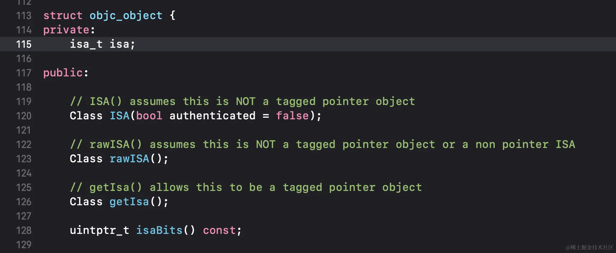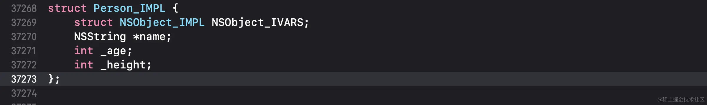 通过对OC文件进行编译得到的C++文件找到对象本质是一个包含Class类型isa的结构体,如下图所示: