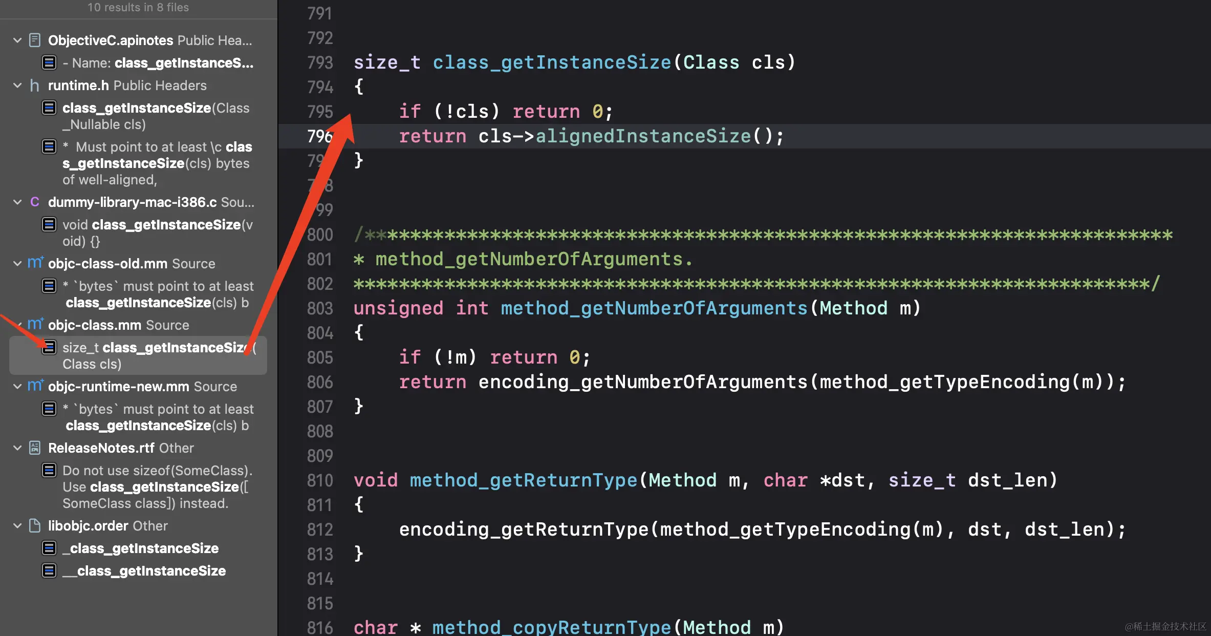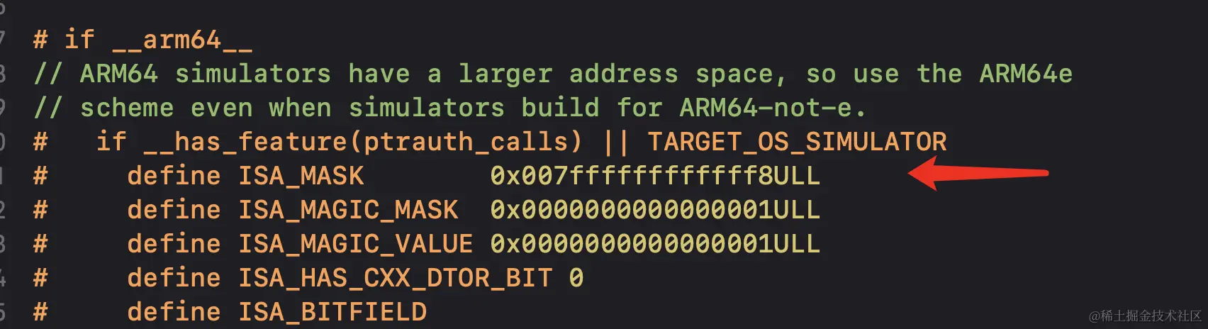 此时我们会发现isa指向的地址和当前类的类对象并不是一个地址,这是由于iOS在arm64架构之后增加了ISA_MASK,需要进行一步位运算,我们可在OC的源码中找到