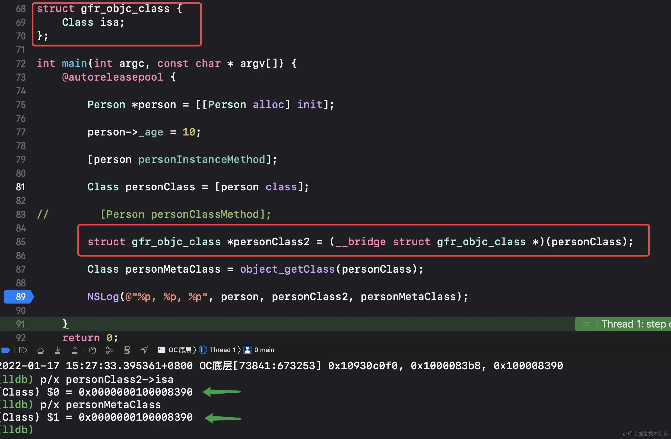 桥接之后解决报错,最后得出类对象isa指向元类对象,但是没有发现ISA_MASK的参与,不知道是不是由于是自己写的结构体所以没有ISA_MASK,欢迎大佬们指教。