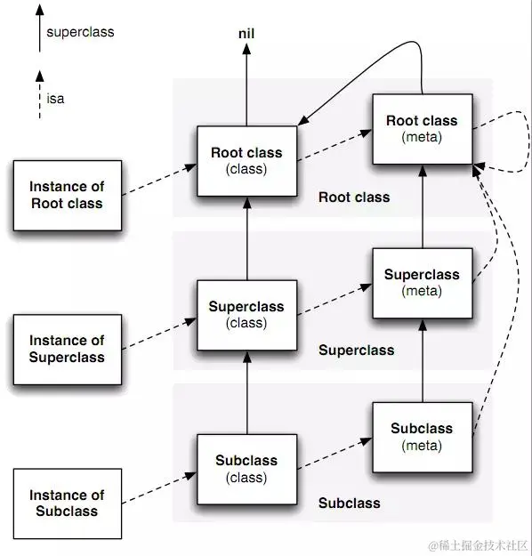 可以很清晰的看到obj_class的superclass的指向,最后我们可以得出网上非常流行的这张指向顺序的图