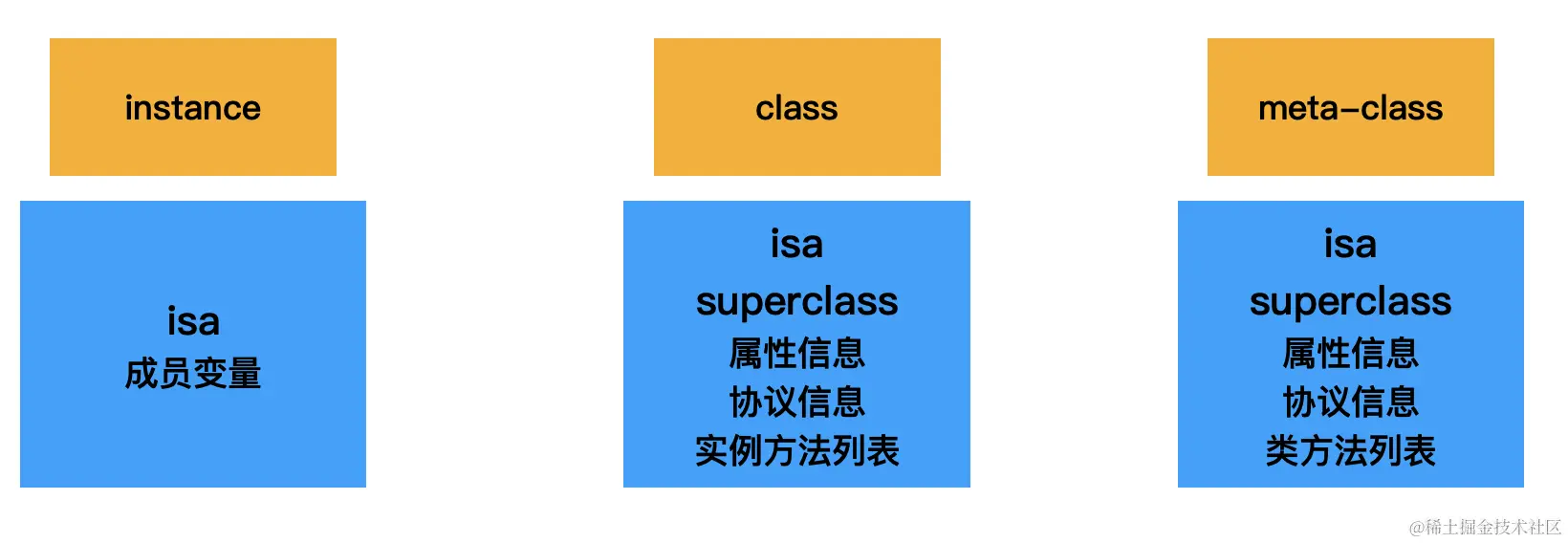 属性会生成一个成员变量,但是get set方法不会出现在实例方法中,实例可能会有多个,所以实例方法会存在类对象中,isa指向当前类的类对象具体如图所示: