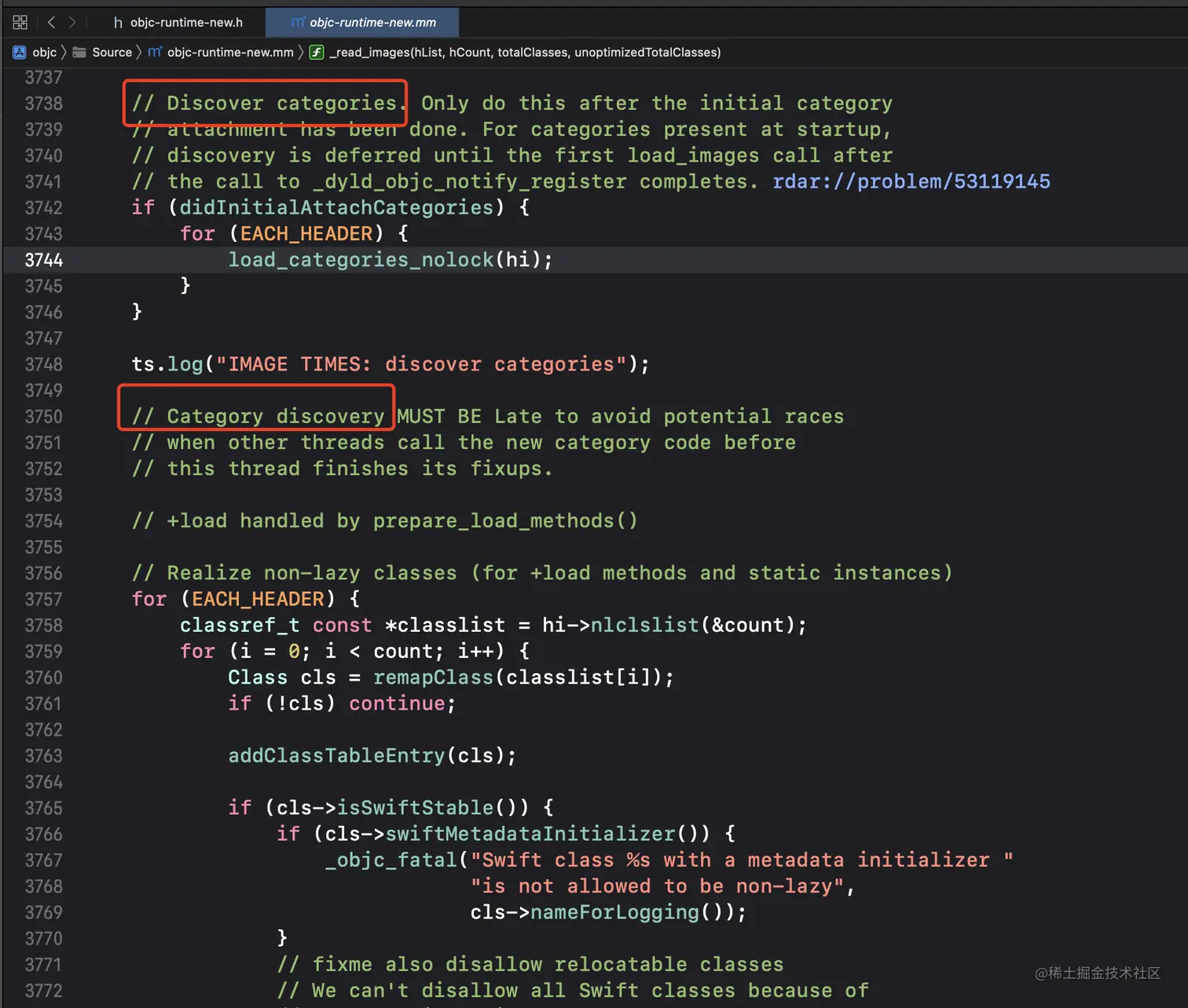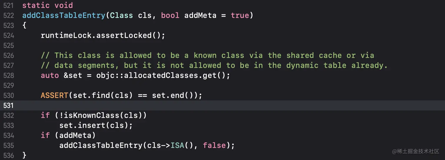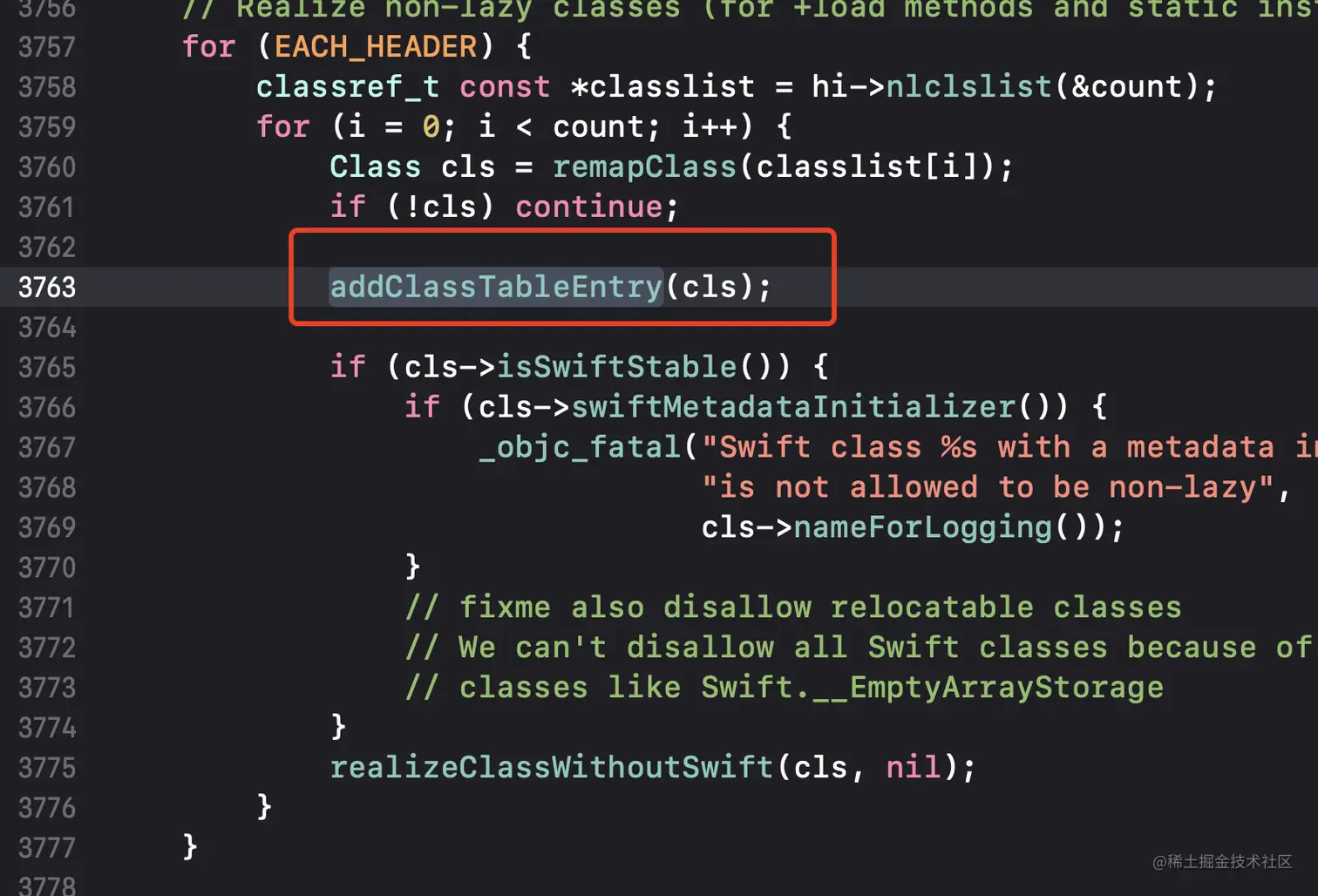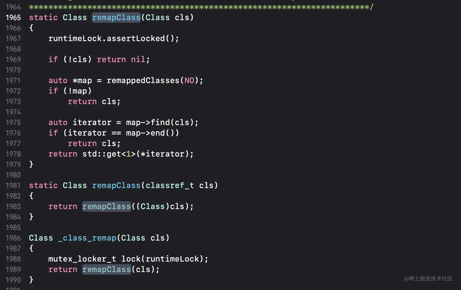 返回之前的_read_images方法找到remapClass方法,点击进去查看,通过cls和map进行判断,如果传入的cls对象不存在则直接返回nil 如果map不存在则直接返回cls对象,迭代器通过通过map映射调用find方法找对应的cls对象,如果迭代器最后map等于map的映射找到了最后,则返回传进来cls对象,最后回到_read_images方法中的遍历调用addClassTableEntry方法,插入到对应的类列表中,所以最终分类的属性、实例方法、类方法、协议信息等重新合并到到对应类中,实现分类的功能。