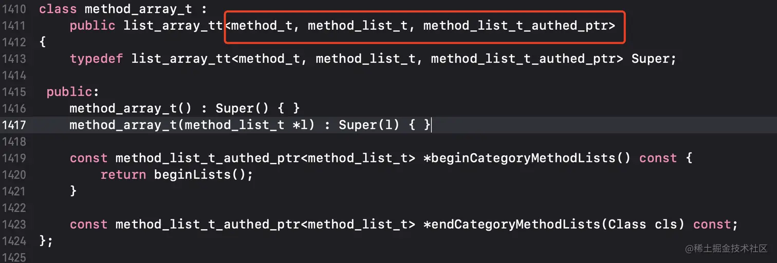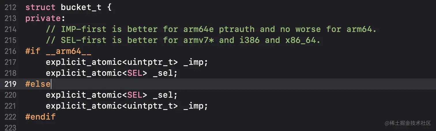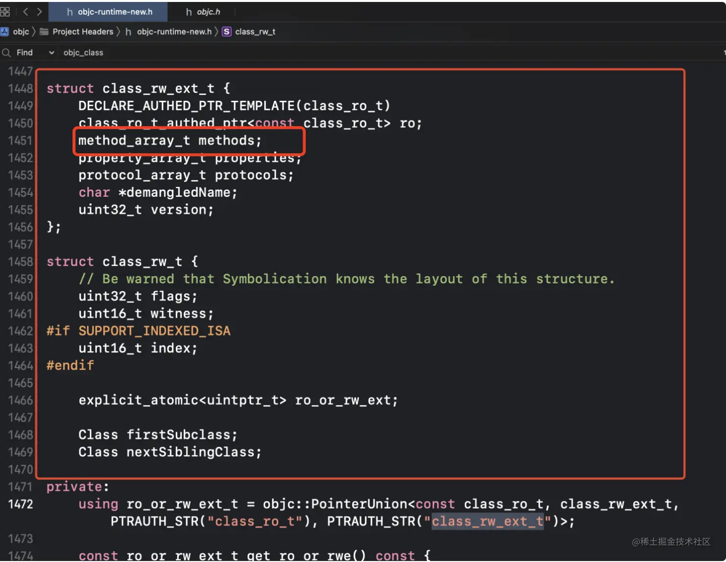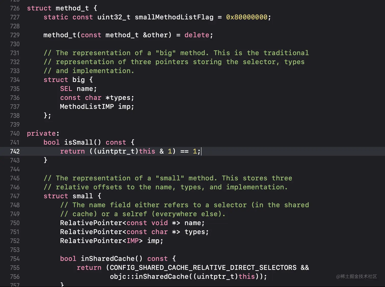 其中method_t是存放方法主要信息,包括方法名、类型、和方法实现的imp,method_t其中又包含两部分,大的和小的,小的通常存储在缓存中