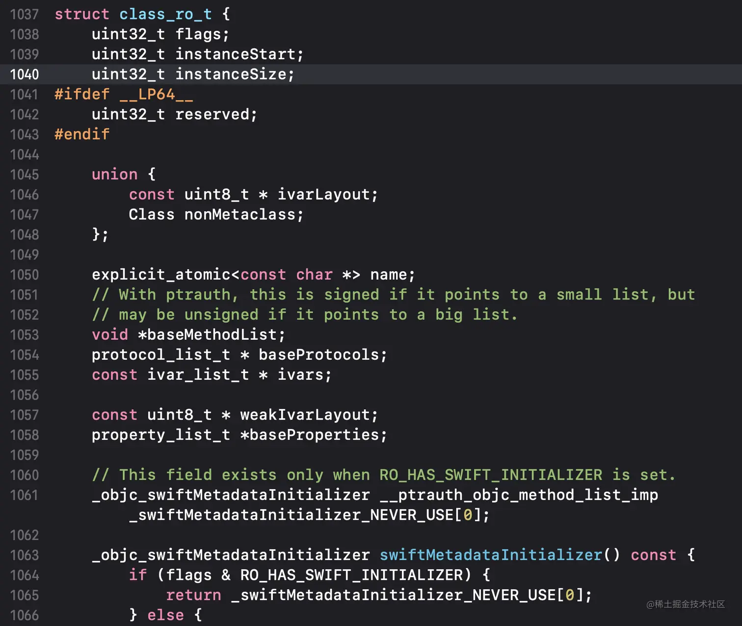 class_ro_t会存放只读(此时不可更改)类的相关信息如:实例大小,方法列表,协议信息等相关的类的信息,可在objc-runtime-new.h中查看