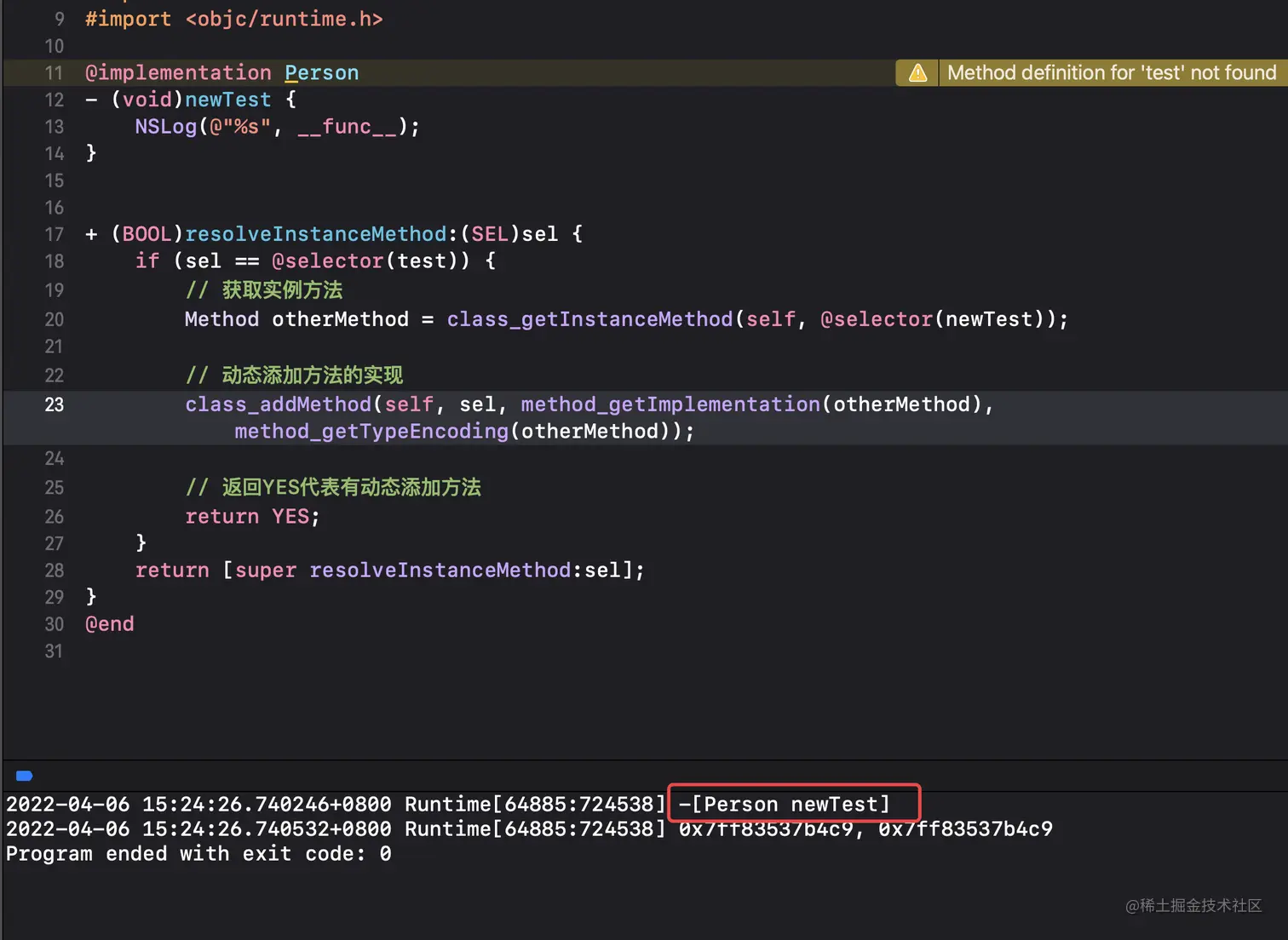 学习了Runtime的动态方法解析后,可以通过Runtime在运行时动态的添加方法,具体实现如下图所示,通过resolveInstanceMethod,可以动态设置方法的实现,测试运行,Person类的test方法的实现成功改为了newTest。