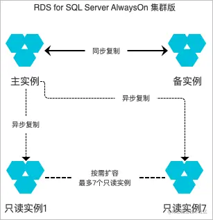 目前SQL Server 2017、2019支持集群版,集群版基于SQL Server源生AlwaysOn技术,实现计算与存储分离,并且可以购买只读实例实现读写分离。集群版可申请只读连接地址实现业务读写分离;同时每个只读实例默认也有独立的内网连接,以便单独使用某个只读实例实现业务查询隔离。说明 集群版实例开启读写分离连接后,主节点、备节点、只读实例均可参与权重分配。开通只读地址后会同时提供主实例地址和只读地址,您需要在应用程序中配置主实例地址和只读地址,实现写请求转发到主实例,读请求转发到只读地址。