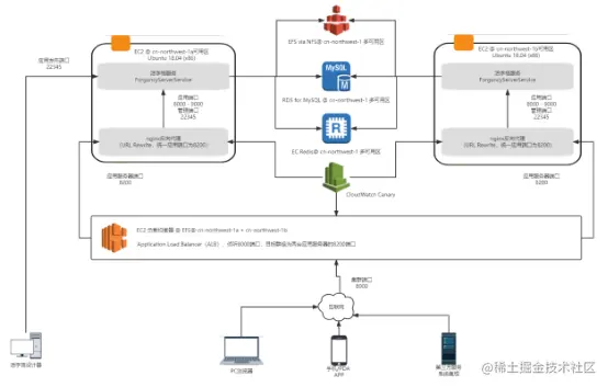 为了实现高可用的目标,本方案的应用服务器设计为位于不同可用区的2台EC2,其他托管服务也选择了多可用区的配置。