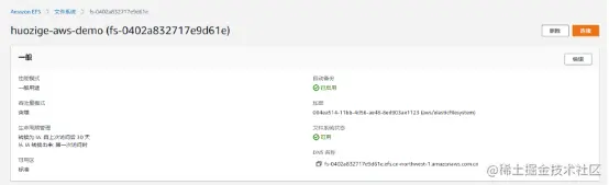 创建完成后,等文件系统的文件系统状态变成“可用”,点击刚创建的文件系统,DNS名称就是用来访问该EFS的地址,记录下来备用。