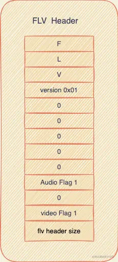 FLV文件头前三个字节保存了F、L、V的ASCII码。第四个字节表示FLV的版本。第五个字节中的第8位表示是否存在视频tag,第6位表示是否存在音频tag。
