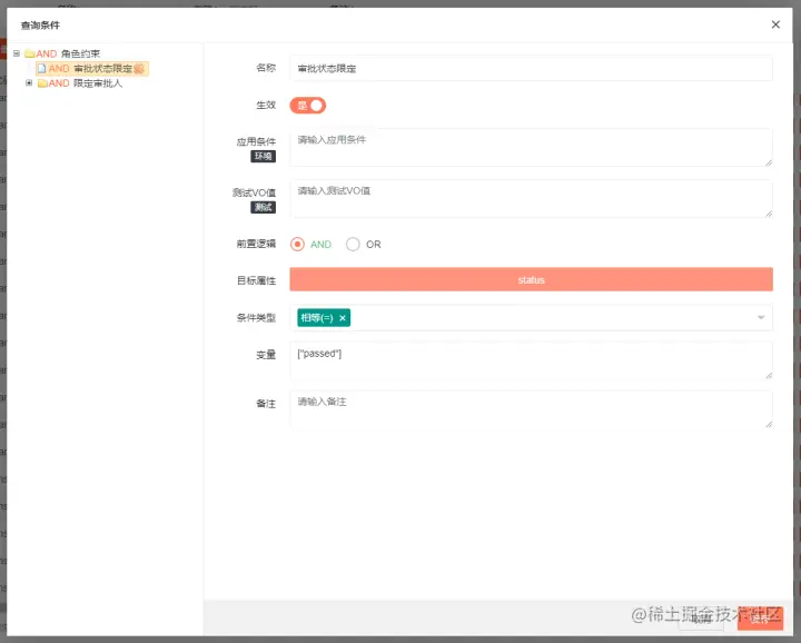 目标属性:即条件表达式中用于过滤的属性字段,如此处我们要求最终查询语句中出现 status='passed' 的条件表达式,那么目标属性就是 status。所以,一个条件节点仅是对一个目标属性的配置,如果要配置多个目标属性的复杂查询,则需要使用条件逻辑树。