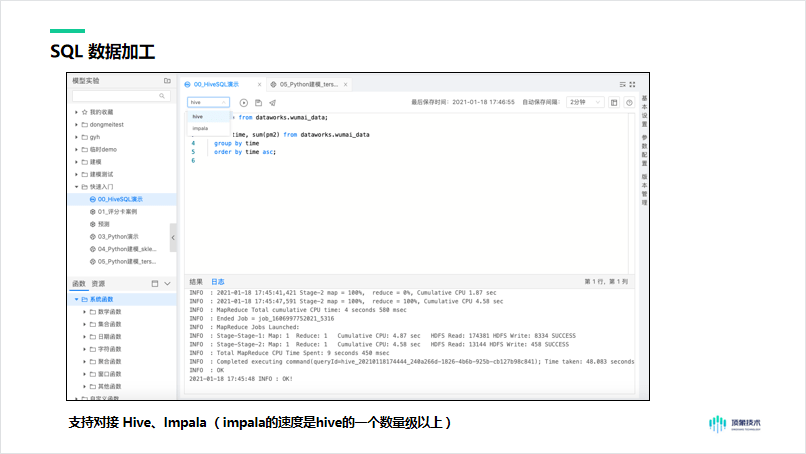 SQL建模适合做数据存取、数据更新、增量与分区管理,还可以做数据查询、数据聚合、数据join等操作,可以直接在数据中台中执行。