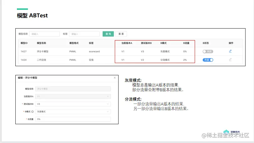 模型平台应该支持模型的A/B Test。模型A/B Test:是用新开发的版本B,与当前正在提供服务的A版本,进行对比。