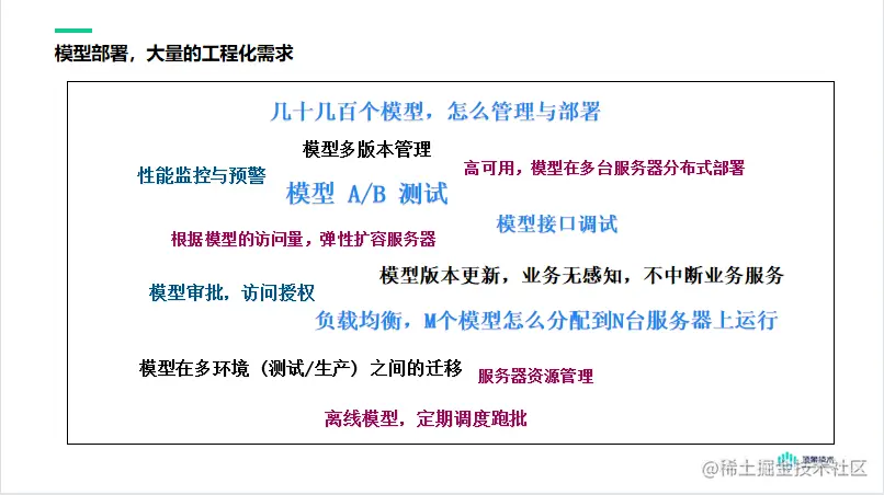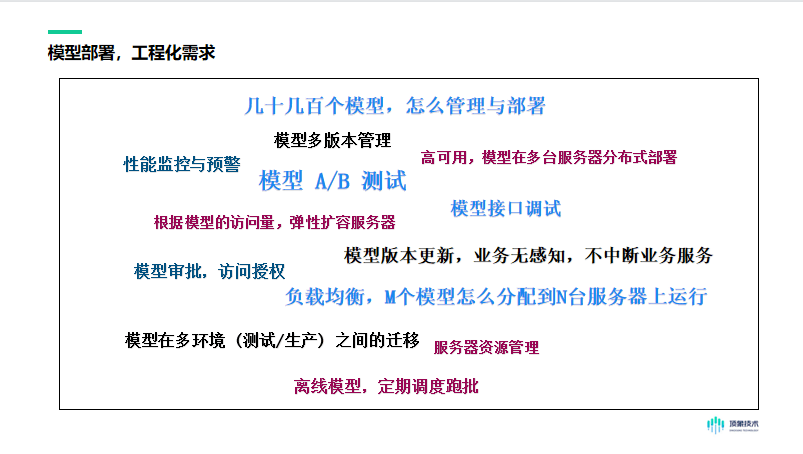 而一个模型的部署,跟任意的一个软件系统部署类似,要考虑很多工程化的问题,除了通用的系统部署问题以外,还有很多模型特有的管理需求,这些需求有: