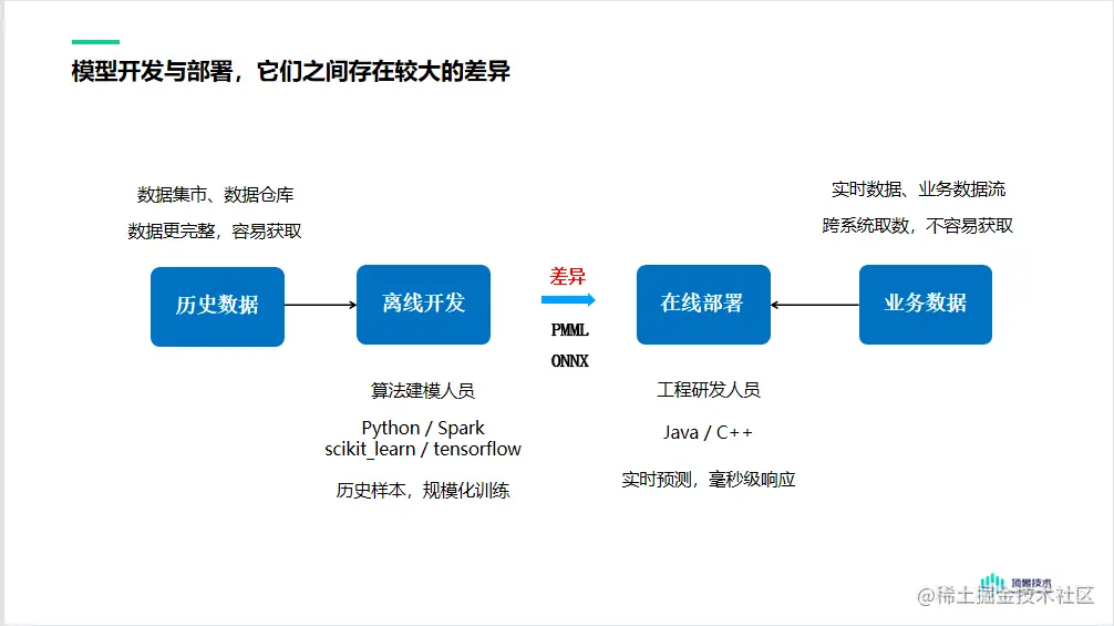 而模型部署是工程研发人员将模型进行在线部署,应用到实时的业务决策中。
