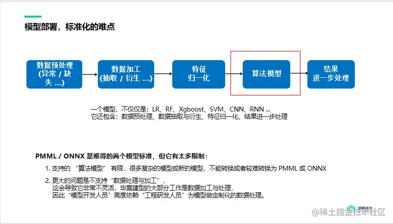 模型部署的一个关键难点是,在实现的应用中,模型部署不仅仅是部署算法模型,它还包括:数据预处理、数据加工、特征归一化、结果的进一步处理。