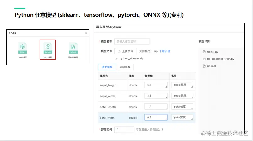 任意的Python模型都可以导入到平台,这个也是顶象平台的核心专利,不仅支持将scikit_learn 开发的模型,也支持 tensorflow 或 pytorch 等框架开发出来的模型,还支持ONNX格式的标准模型。