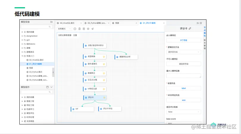 此外,建模平台构建在数据中台之上,最常用的建模工具有三种:SQL、Python、低代码 (低代码也可以说是 可视化或模块化建模)。