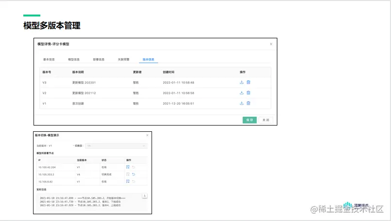 上图展示一个模型的多版本信息,以及版本的创建时间、版本的说明信息。下图展示模型的版本切换,为了避免让业务出现中断,模型必须要部署在2台服务器以上,才允许进行版本切换,在一台服务器上切换时,其他机器可以继续提供服务,从而实现模型的模型升级的业务部感知。