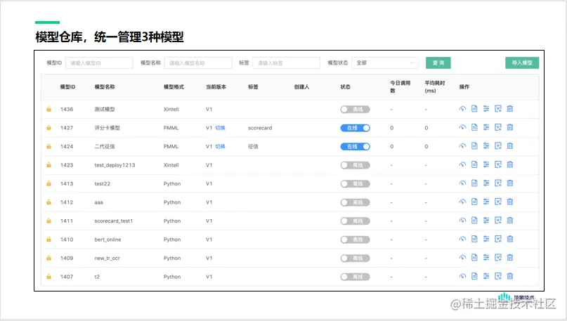 展示的信息包括:模型名、模型格式、当前版本、标签分类信息、模型的状态(离线或在线)、模型今日调用次数、平均耗时等。