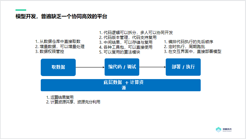 我们可以将模型开发简单理解为在底层的数据与计算资源之上,建模人员获取数据,然后编写与调试代码,最后进行部署执行。