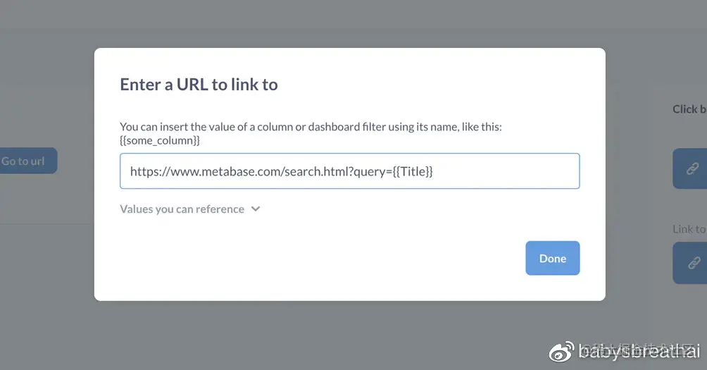 接下来,我们将设置产品详细信息当人们点击产品名称部件,Metabase将它们发送到外部站点,并使用部件中的值参数化URL。我们可以将它们发送到任何外部站点,但在本例中,我们将它们发送到Metabase文档的搜索页面,这样您就可以看到实际的参数化(因为阅读我们的文档将使您成为一个更好的人)。