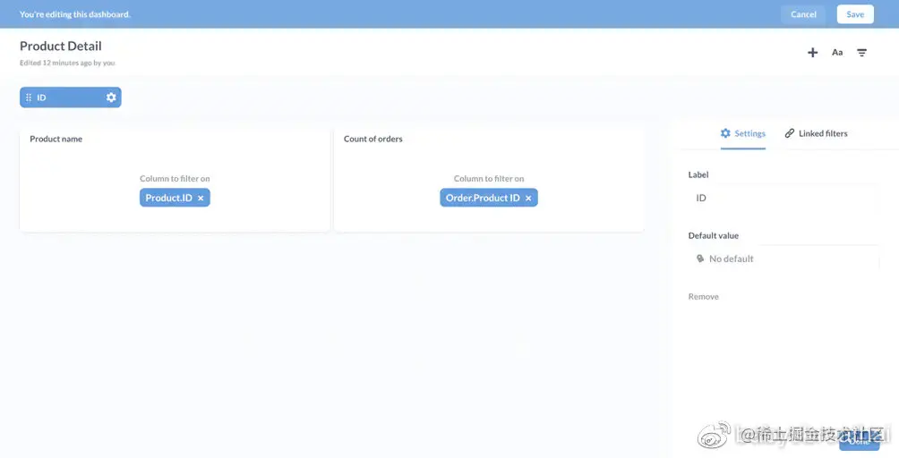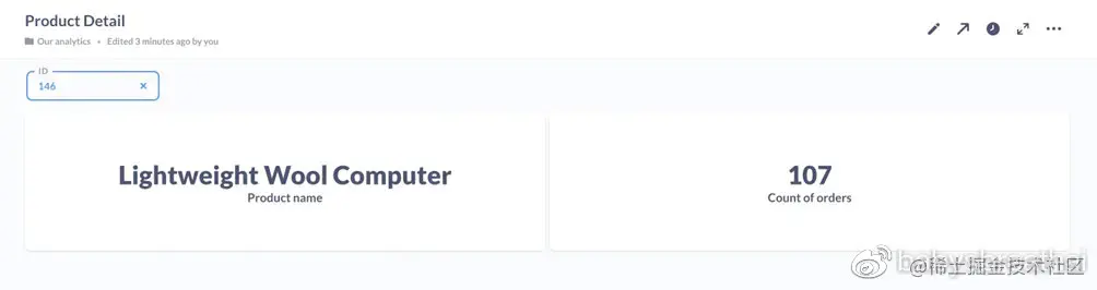 返回到产品详细信息仪表盘。在编辑模式下,添加我们新保存的问题,别忘了我们也需要一个仪表盘过滤器。要添加一个,请单击添加筛选器图标在右上角,然后选择身份证件。为每张部件选择合适的筛选列-我们的产品名片将进行筛选Products.ID,而我们的订单数量应该会有所增加Orders.Product_ID。我们将这些问题的可视化设置为数量, 这样他们就可以像变量一样工作了,文本部件根据筛选器中的值更改其文本。