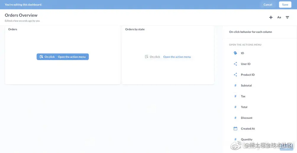 由于我们使用查询生成器来编写订单问题,Metabase将默认的单击行为设置为打开操作菜单,它允许人们钻取数据.