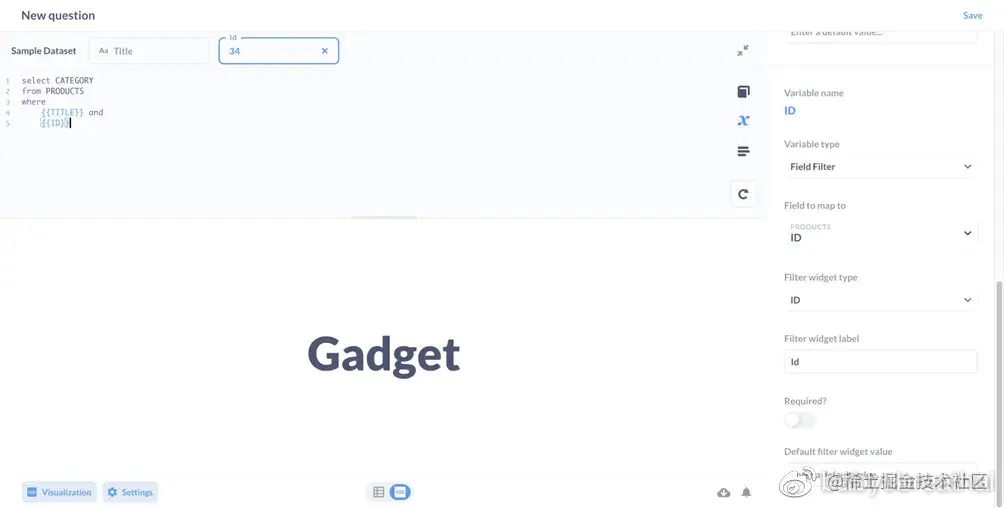 Metabase滑出一个侧栏,您将看到两个变量:Title和ID。我们希望此问题在ID或Title字段中输入值时向我们显示产品类别。从下拉列表中,设置变量类型两者都是为了过滤器继续绘制地图Title变量产品名称字段和地图ID到产品.ID.