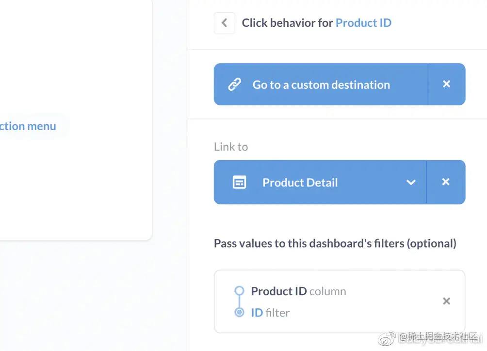 图8。我们设置的单击行为摘要:转到自定义目标,我们将其设置为产品详细信息仪表盘,然后从产品ID列添加到产品详细信息面板上的ID筛选器。
