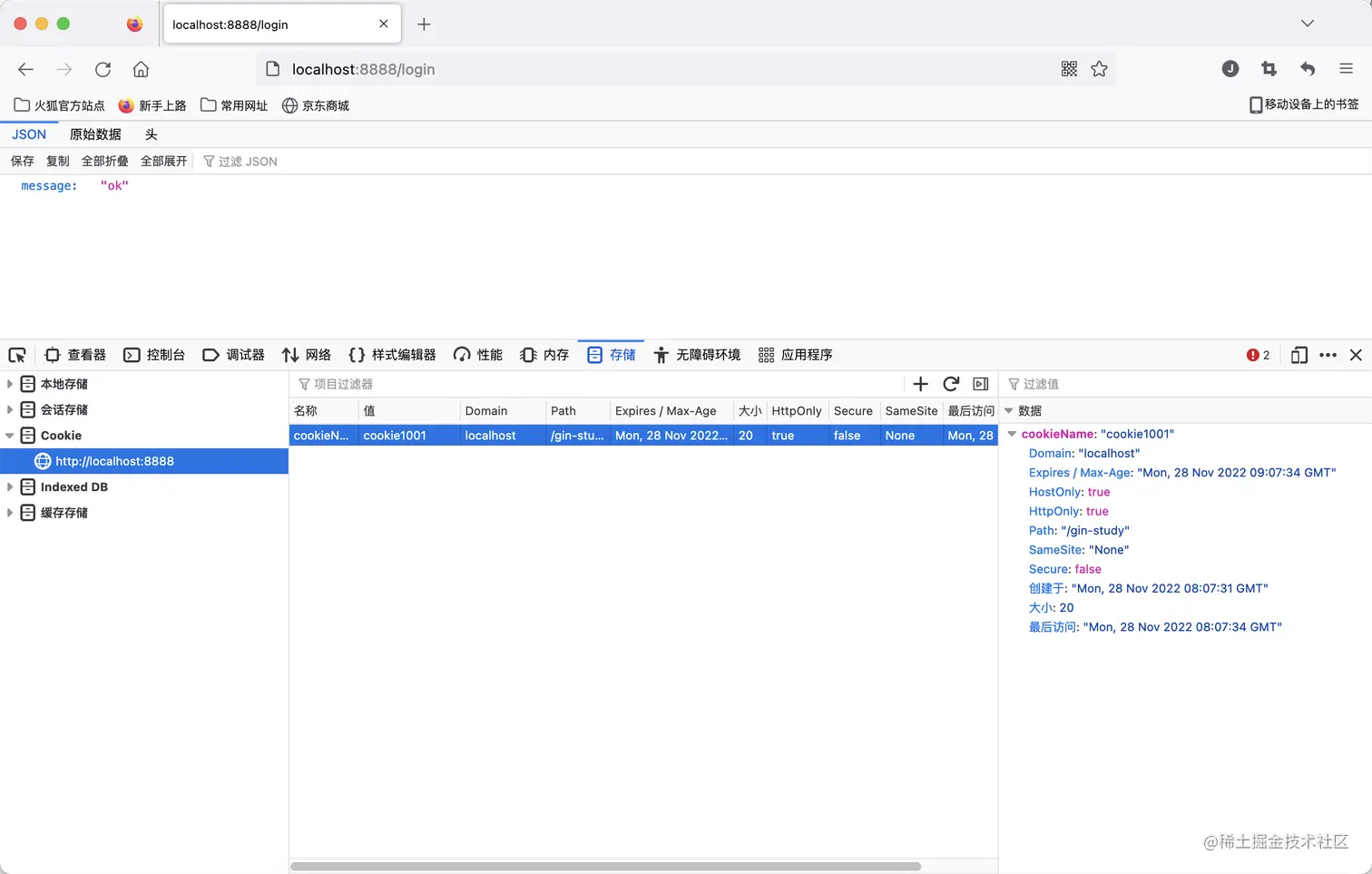 通过浏览器访问login页面,可以看到在浏览器的Cookie里面已经保存了我们之前设置的Cookie。
