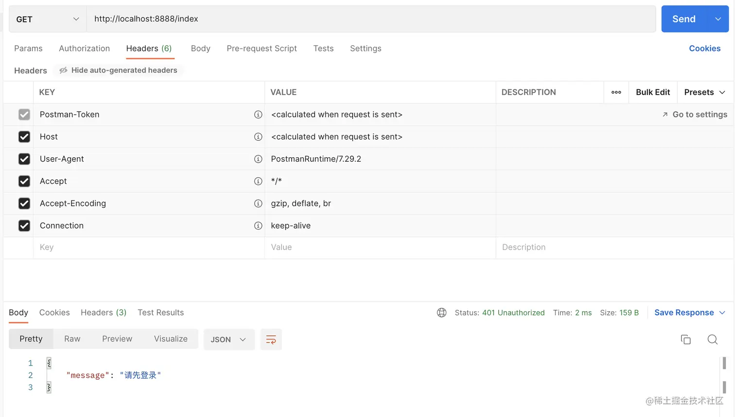 然后在postman中不携带cookie访问index,会返回请先登录的提示。