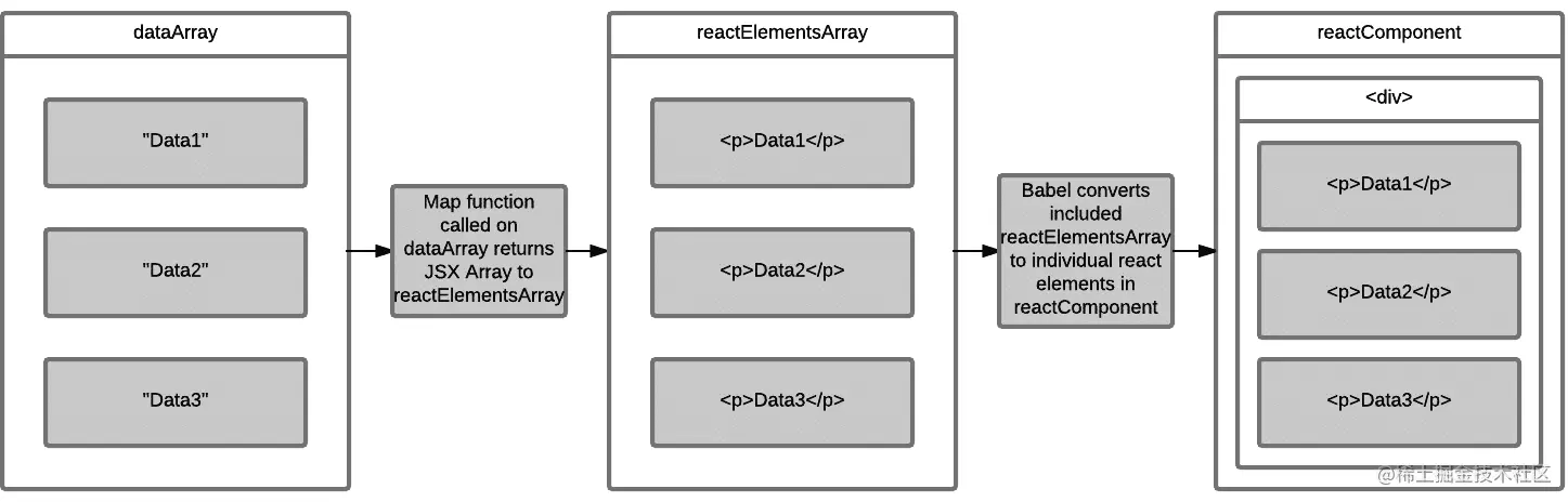 在JSX中,可以将数组直接放入插值表达式,数组将会被自动展开,数组中的元素会被直接渲染到该位置