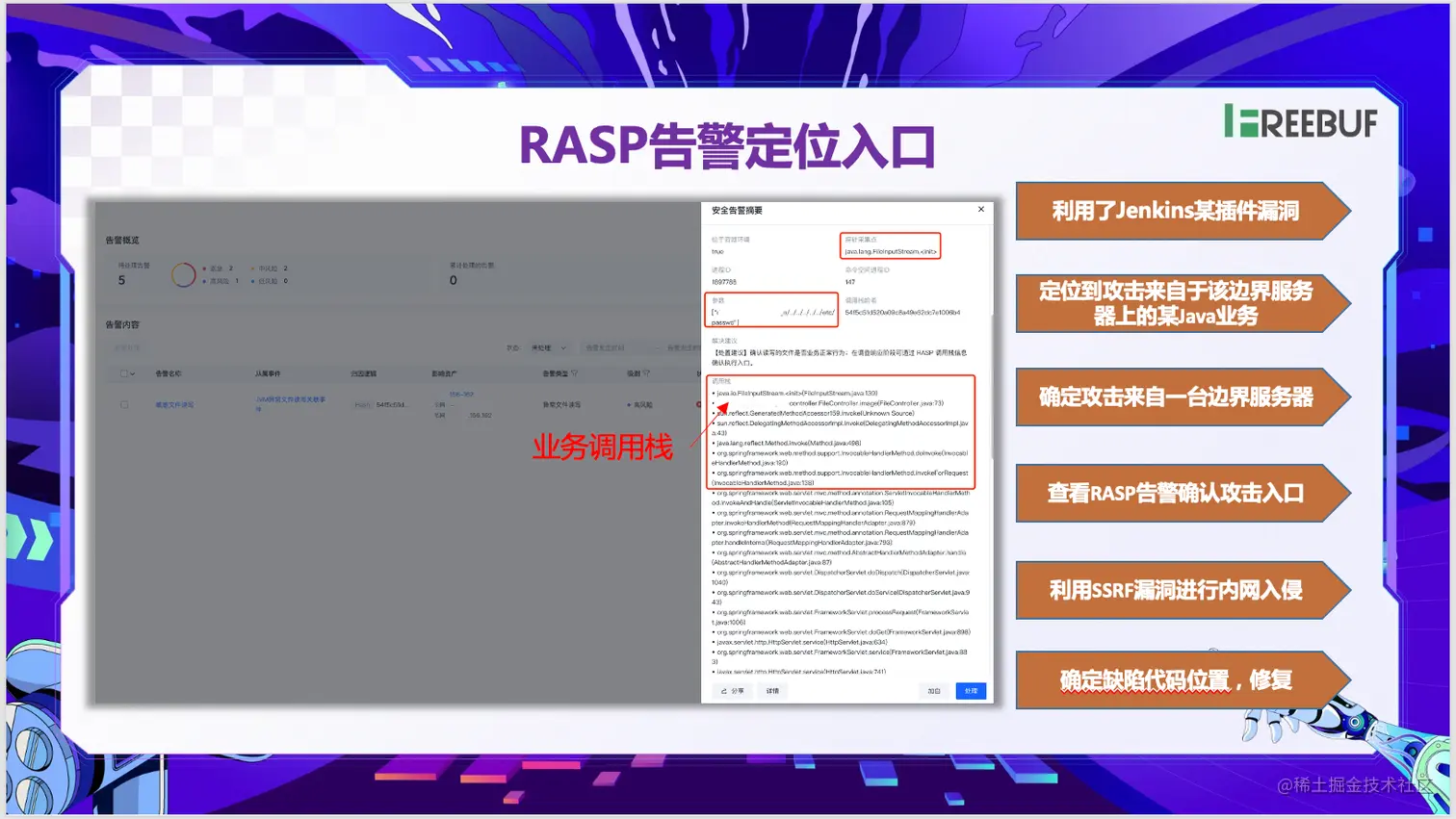 在今年的一起 Java RCE Alert 告警引起的应急中,攻击者从边缘机器进来,发现任意文件读取和ssrf漏洞可利用后,进行了盲打,找到了一个jenkins集群下马。在迅速的CWPP告警和阻断后依然不断更新方法和目标,进行了多次对抗和攻击尝试。在CWPP提供了精准的告警信息后,运营人员根据自动关联事件排查其它告警,迅速定损止损,并通过CWPP平台快速下发RASP防护,将捕获的运行时告警实时上报,通过CWPP强大的告警溯源能力和处置能力有效解决以上问题。