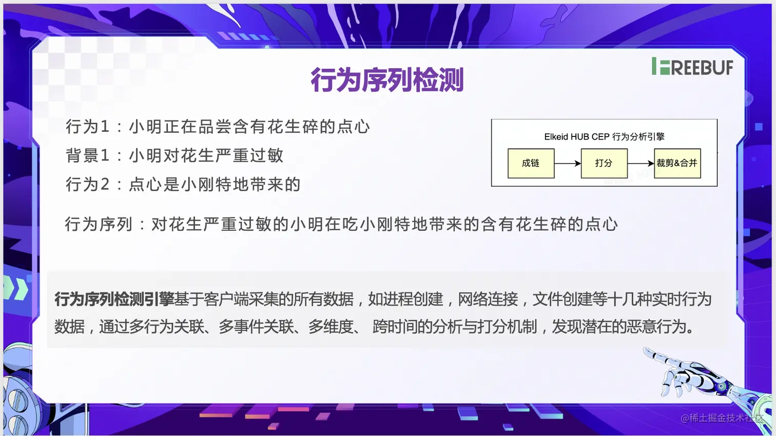 - 首先是告警本身的上下文追加,也就是行为序列检测。如下图,三个信息本身都是不具备显著风险,但组合在一起,形成基于背景的行为序列,这个行为序列本身就具备一定风险,则需要告警。