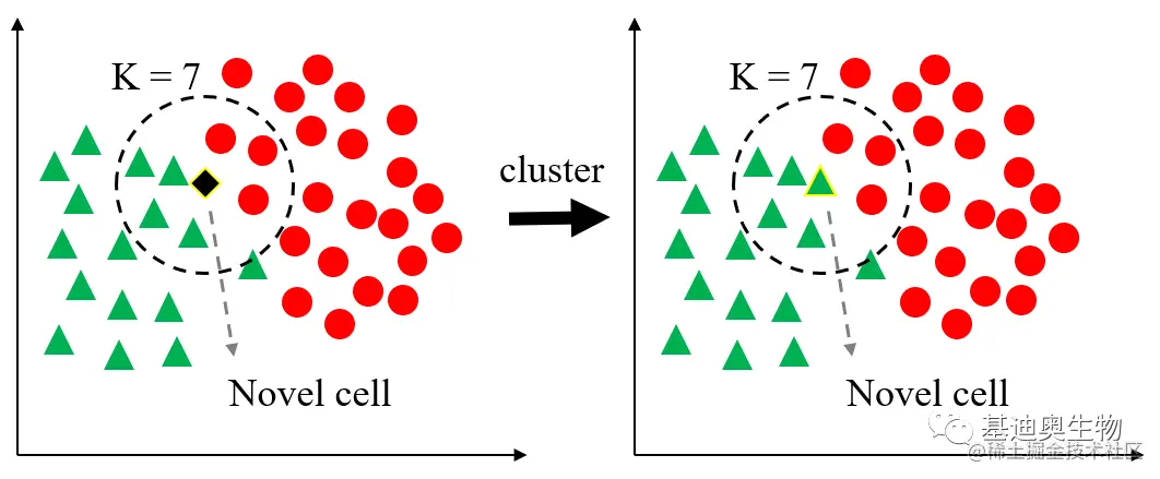 但是,当k=7,预测的新细胞结果就和k=4的结果不一样了,变成了绿色亚群。从这里我们就可以看出K的取值太重要了。