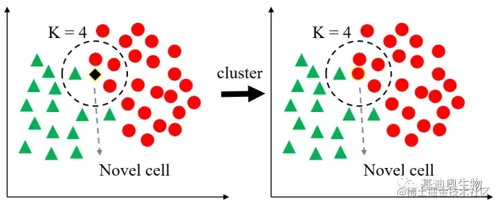 图1 当K=4时,判定新细胞属于红色圈亚群