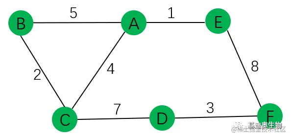 如图6所示,数字是两个节点的权重值,该图是初始的graph,A-F一共6个节点。初始阶段,节点之间的合并以节点A为例: