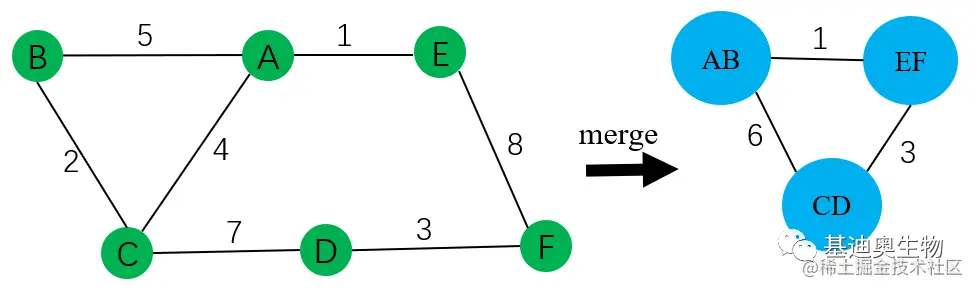 根据公式说明,小于0则不进行社区划分,大于0则取最大的模块度增益对应节点进行合并,因此AB合并、CD合并、EF合并,合并之后我们得到(图7所示):