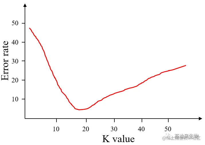 如图3所示,当k值增大时,一般错误率会先降低,因为有周围更多的样本可以借鉴了,分类效果会变好。但注意,和K-means不一样,当k值更大的时候,错误率会更高。这也很好理解,比如说你一共就35个样本,当你K增大到30的时候,KNN基本上就没意义了。
