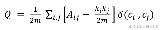 模块度的定义就是描述社区内紧密程度的值,或者说是评估一个社区网络划分好坏的度量方法,记作Q,取值范围为 [ -1/2 , 1 ),公式如下: