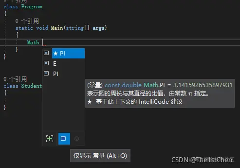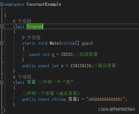 (2)常量隶属于类型而不是对象,即没有“实例常量”,非要创建自定义”实例常量“,那么只能通过创建只读实例字段来实现,但是创建自定义常量的时候最好确定使用范围。还要注意区分“成员常量”和“局部常量”