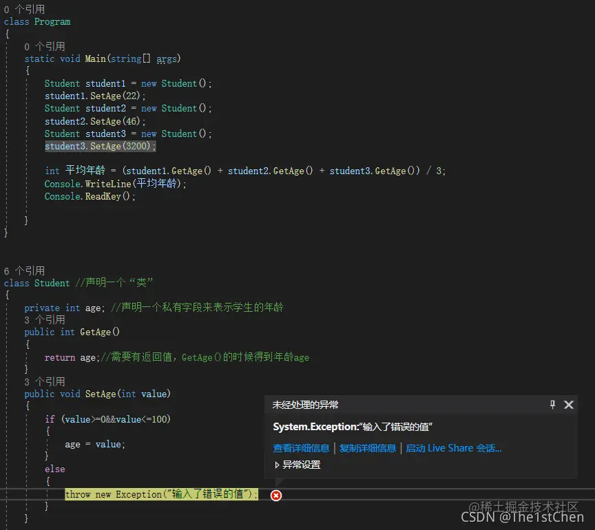 在使用属性(property)来表示对象的状态时,对字段进行了私有化,外部无法对其访问,而是通过加上逻辑限制和实时(动态)计算得出来的值来表示对象的状态,那么就对对象或类型的特征表示起到了很好的保护作用(在给 “age” 加了一层私有访问再通过 Get&Set 方法计算得出值 的着一层皮之后,这里输入了一个非法值,运行抛出异常,对年龄特征的合理性有了一个很好的保护)。