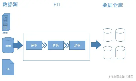 ETL(Extract-Transform-Load)是将数据从来源端经过抽取(extract)、转换(transform)、加载(load)至目的端的过程,ETL较常用在数据仓库,从数据源抽取出所需要的原始数据,经过数据清洗,最终将清洗后的数据加载到数据仓库中去。