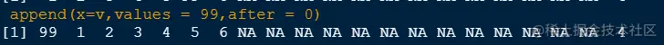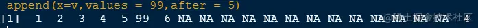 可以使用 append() 函数,以下代码表示,在x这个向量的5这个元素后面插入一个99的元素:
