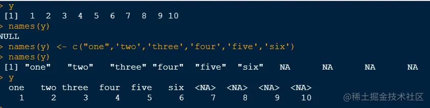 我们可以使用 names() 函数为向量的每一个元素添加名称: